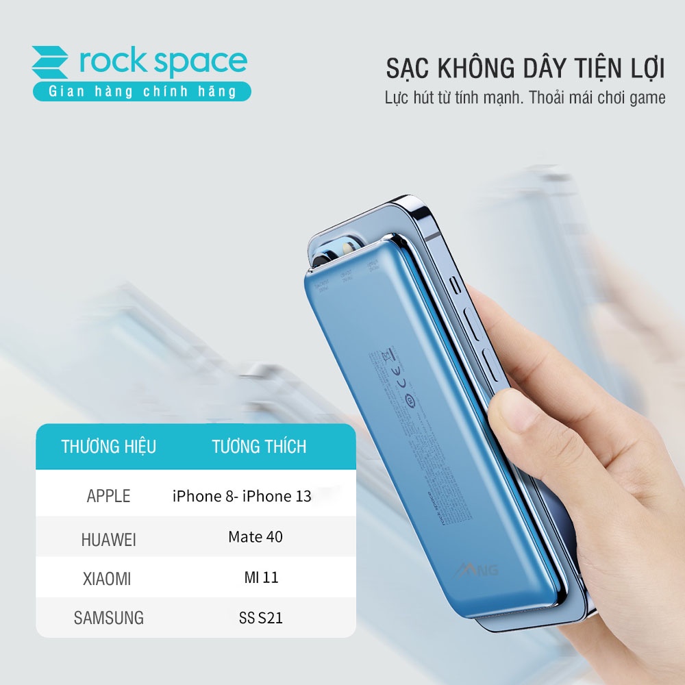 - Pin sạc dự phòng không dây Rockspace P88 hỗ trợ công nghệ magentic cho iPhone 8- 12,13, Mi11, Samsung S21, Mate40, dễ dàng dính chặt vào lưng điện thoại với nam châm hút siêu mạnh