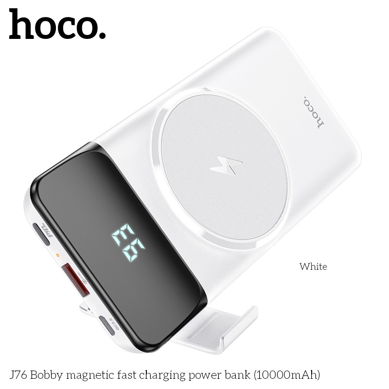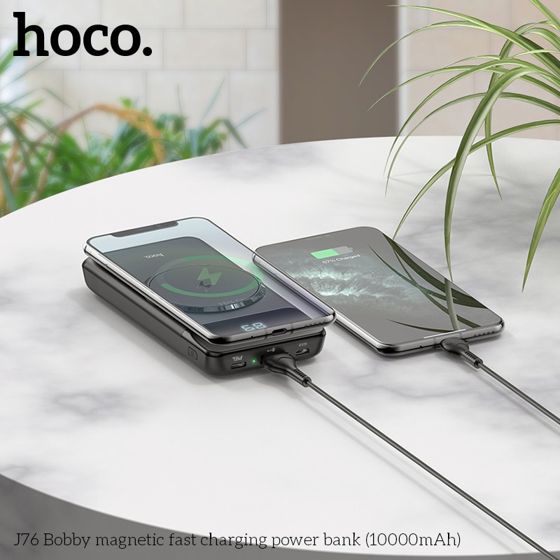 SẠC DỰ PHÒNG HOCO J76 SẠC KHÔNG DÂY SIÊU TỐC PD 20W / 10000MAH - CHÍNH HÃNGSạc dự phòng Hoco J76 hỗ trợ sạc không dây, công suất PD20W sạc nhanh siêu tốc, dung lượng 10000mAh, công suất tiêu thụ khi sạc đạt 70%, có thể sạc đầy từ 2-2,5 lần cho điện thoại dung lượng pin 3000mAh (như iPhone XS Max hoặc Samsung S10 Plus) tích hợp 1 cổng ra USB, 2 cổng vào MicroUSB và Type C để cắm điện cho SDP này, trên J76 có đèn LED hiển thị vạch pin. J76 sạc cho tất cả các thiết bị điện thoại Smartphone và máy tính bảng, hỗ trợ sạc không dây với các dòng máy có tính năng này.