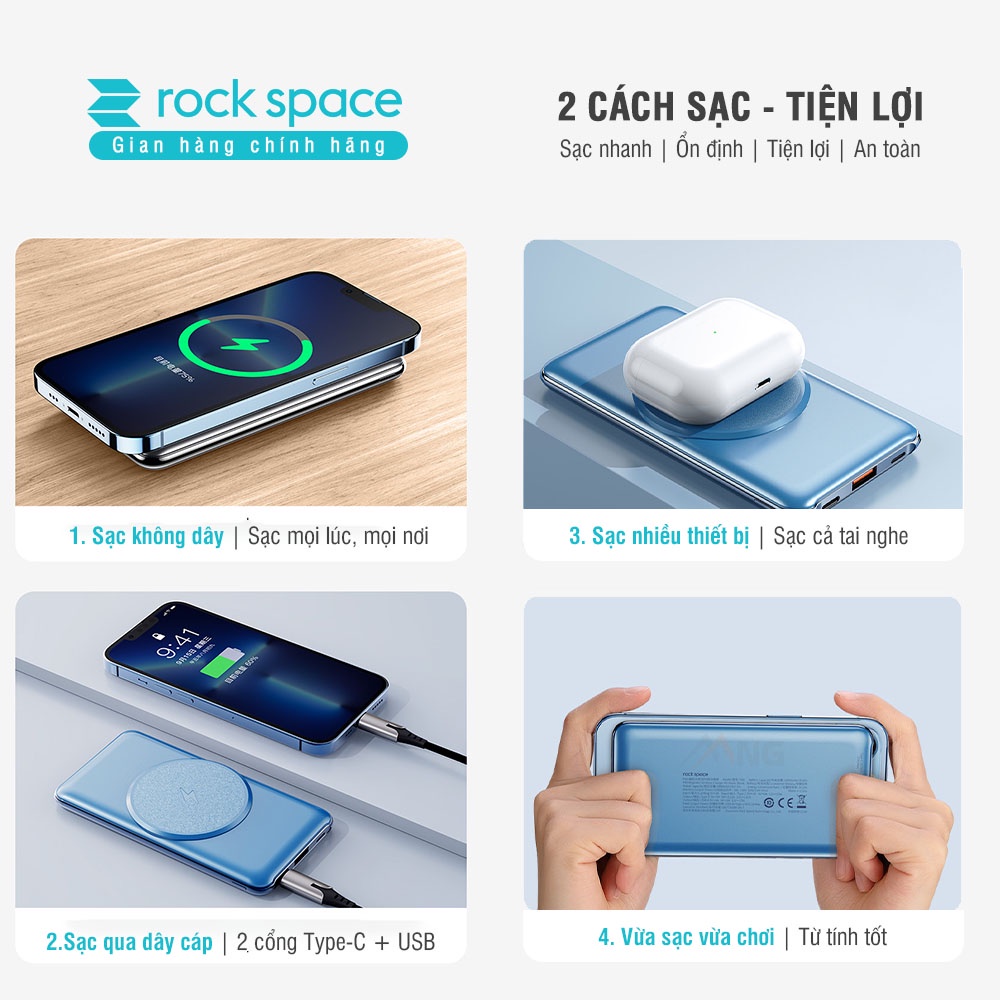 - Pin sạc dự phòng không dây Rockspace P88 hỗ trợ công nghệ magentic cho iPhone 8- 12,13, Mi11, Samsung S21, Mate40, dễ dàng dính chặt vào lưng điện thoại với nam châm hút siêu mạnh