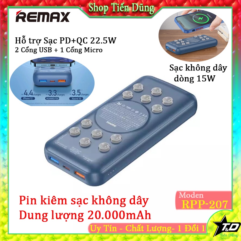 Pin Sạc Dự Phòng Không Dây Remax RPP 207 Dung Lượng 20000mAh Sạc Nhanh QC3.0 18W, 22.5W, PD 18W, VOOC 2.0.✅ Hỗ trợ sạc không dây nguồn ra tối đa 15W