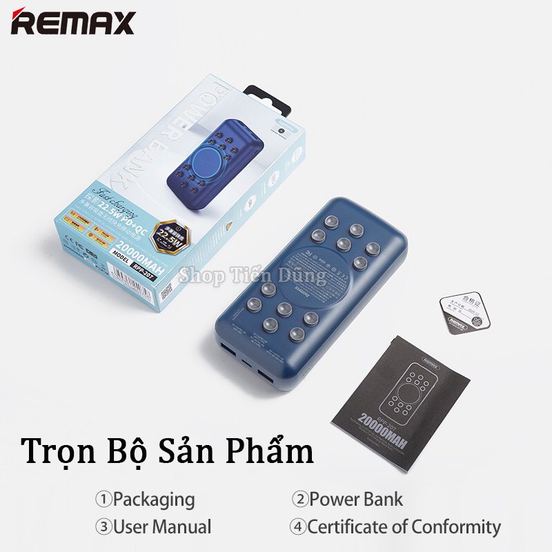 Pin Sạc Dự Phòng Không Dây Remax RPP 207 Dung Lượng 20000mAh Sạc Nhanh QC3.0 18W, 22.5W, PD 18W, VOOC 2.0