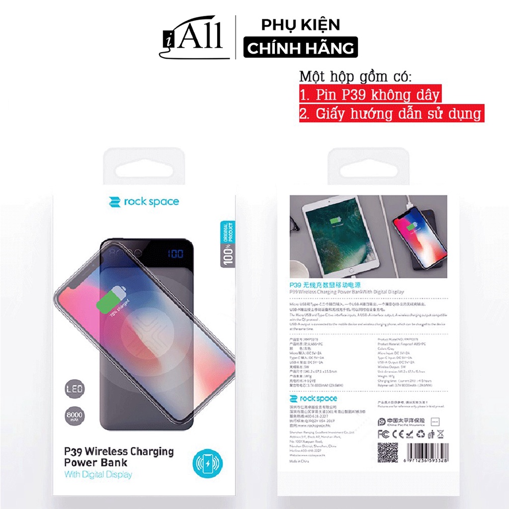 - Pin Dự Phòng Hỗ Trợ Sạc Không Dây Rock Space P39 8000mAh RMP0378 là một trong những phụ kiện sạc dự phòng không dây đầu tiên xuất hiện ở Việt Nam có thiết kế kiểu dáng gọn nhẹ, không dây tiện lợi, thuận tiện di chuyển.
