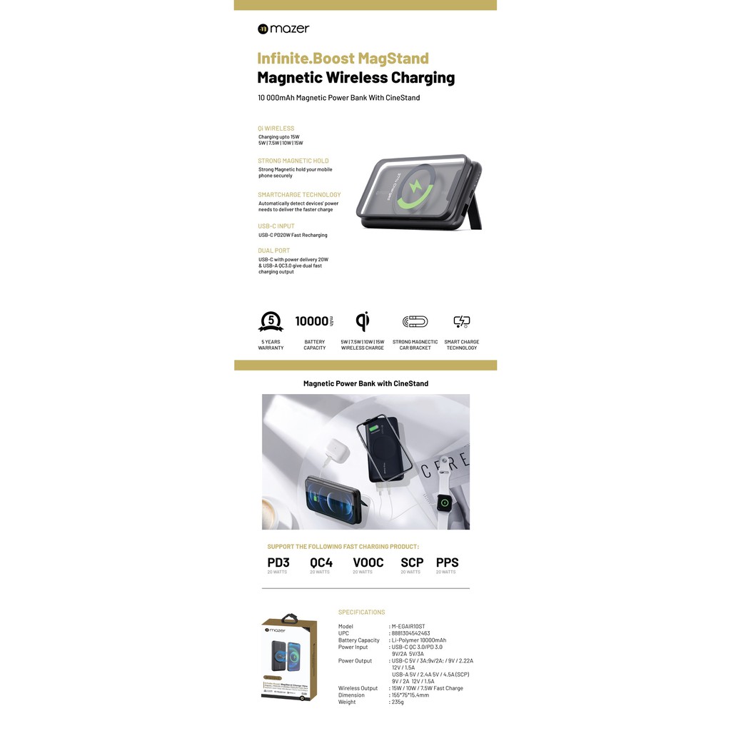 Pin Sạc Dự Phòng Không Dây MagSafe Mazer 10000mAh Infinite.Boost MagStand Qi Wireless 15W USB-C PD 22.5W QC 3.0