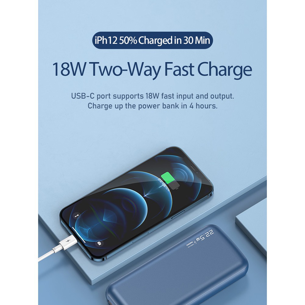 Việc cổng vào/ra Type C tích hợp công nghệ sạc nhanh 2 chiều 18W giúp người dùng nhanh chóng nạp đầy năng lượng trở lại cho pin. Theo thí nghiệm từ nhà sản xuất, bạn chỉ cần khoảng 4 tiếng đồng hồ để sạc đầy nguồn điện cho cục pin sạc dự phòng không dây này.