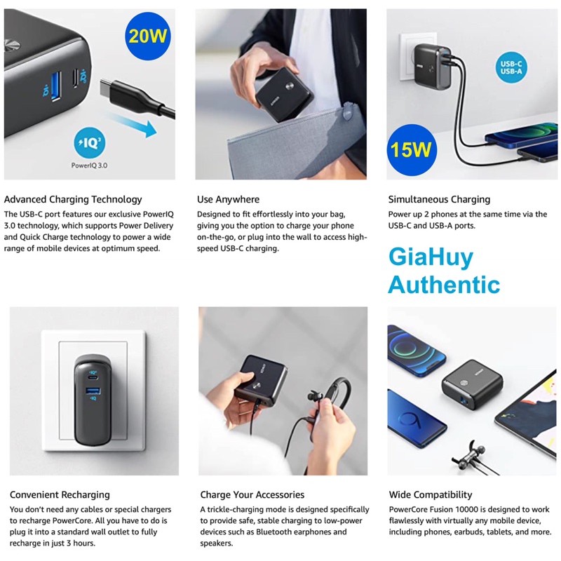 PowerCore Fusion 10000 được thiết kế để hoạt động hoàn hảo với hầu hết mọi thiết bị di động, bao gồm điện thoại, tai nghe nhét tai, máy tính bảng, v.v.