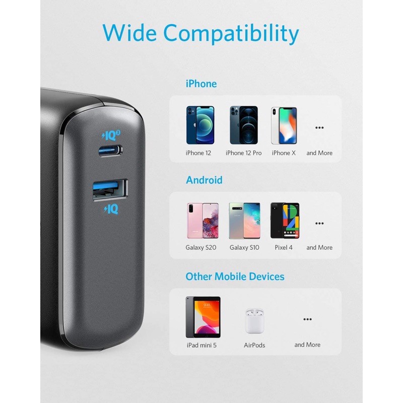 Cổng USB-C 20W Được trang bị công nghệ gốc của Anker Power IQ 3.0 (Gen2): hỗ trợ công nghệ Power Delivery và Quick Charge để cung cấp năng lượng cho nhiều loại thiết bị di động với tốc độ tối ưu.