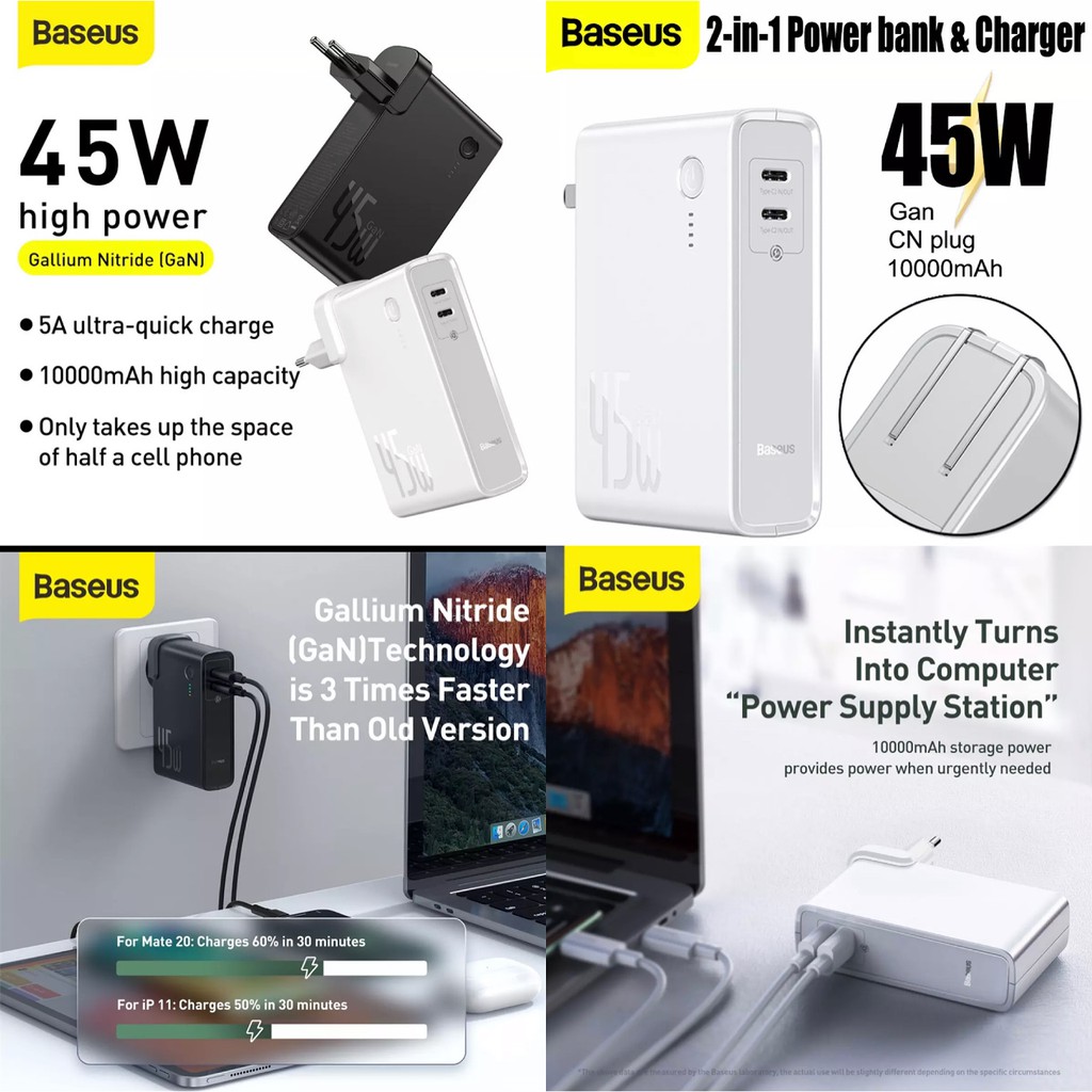 Bạn có thể sạc cho Laptop, Máy tính bảng, Smartphones và sạc lại cho Baseus 2 in 1 ở bất cứ nơi đâu với chức năng sạc dự phòng của Baseus 2 in 1, cũng như dễ dàng sạc lại cho Baseus 2 in 1 tại bất nơi đâu có nguồn điện (quán cafe, quán ăn, nhà chờ xe, bến tàu, sân bay).