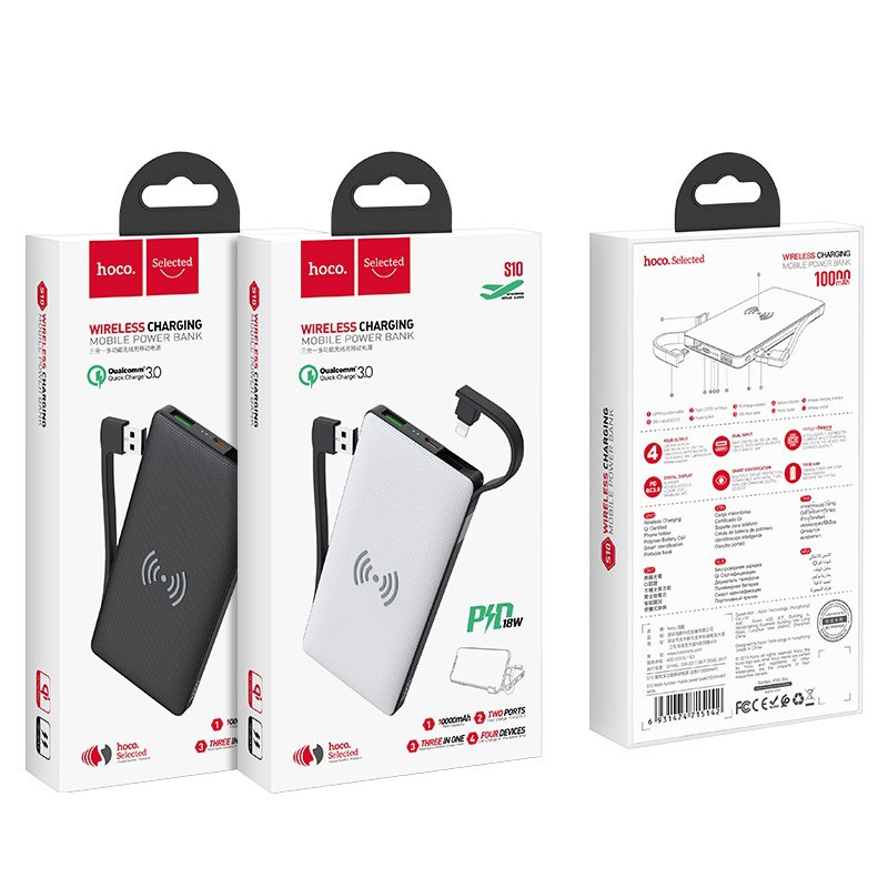 Pin dự phòng kiêm sạc không dây Hoco S10 Dung lượng 10000mAh USB QC / FCP 18W và đèn LED đầu ra Type-C PD / QC 18WTrên thị trường có rất nhiều thương hiệu như Pin dự phòng Xiaomi, Pin dự phòng anker, Pin dự phòng Remax... Nhưng Hãng Hoco tung ra sản phẩm có 1 Không 2 này. Pin dự phòng Kiêm sạc không dây Hoco S10 với dung lượng 10.000 mAh, sạc nhanh QC3.0 18W.