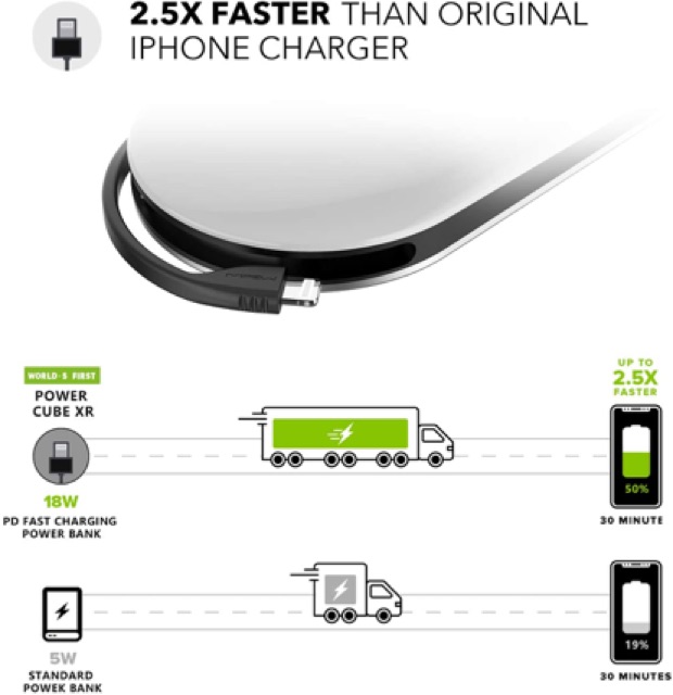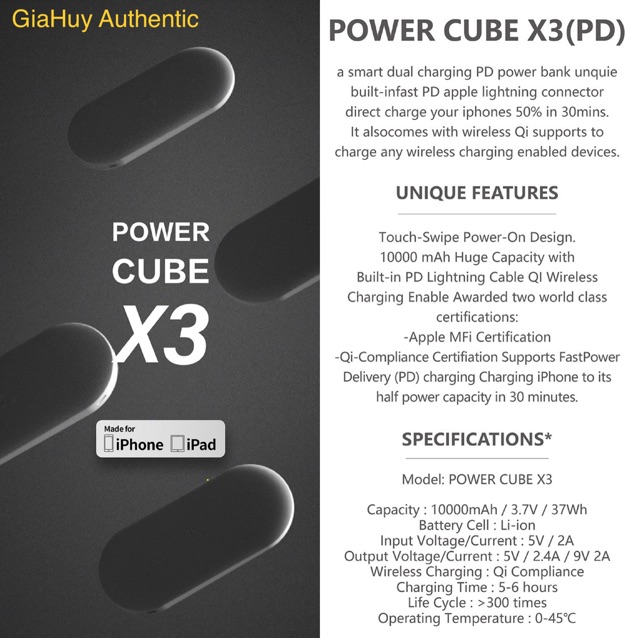 - Sạc nhanh PD 18W với cáp USB-C ra Lightning chuẩn MFi liền thân, Power Cube X3 có thể sạc đầy iPhone X của bạn đầy 50% pin trong 30 phút.