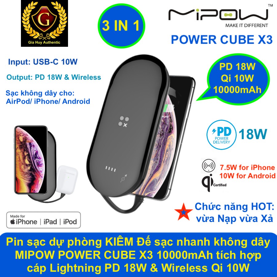 Pin sạc dự phòng KIÊM Sạc Nhanh không dây MIPOW POWER CUBE X3 10000mAh tích hợp cáp C ra Lightning MFi PD 18W