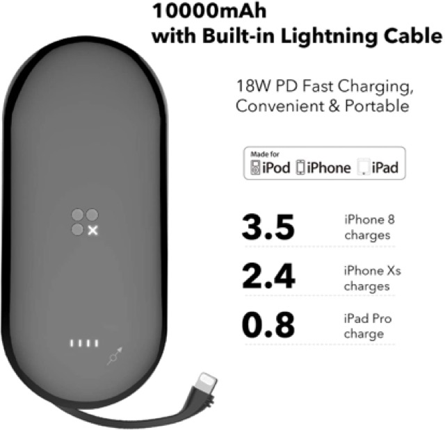 - Cáp Lightning PD 18W tích hợp, đạt chứng nhận Apple MFi, bạn không cần phải tìm kiếm cáp sạc hoặc không cần phải tốn tiền mua thêm cáp USB-C ra Lightning nữa.
