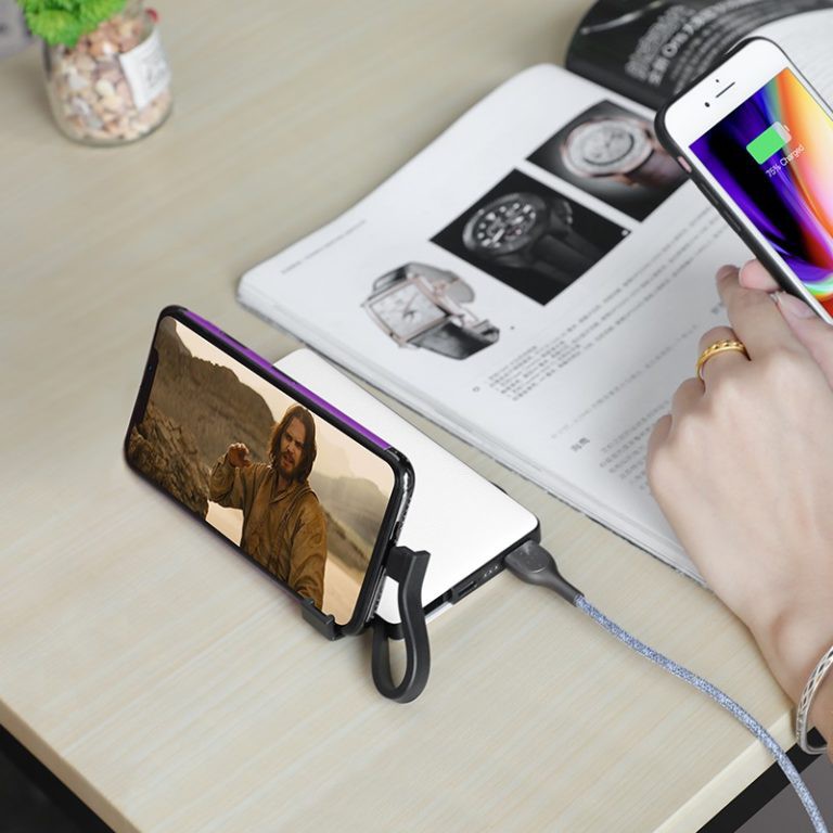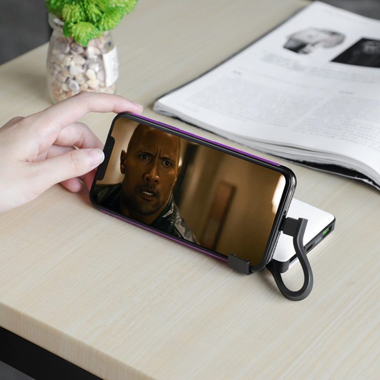 Đặc biệt trên Pin dự phòng tích hợp sẵn 2 cáp Micro và Lightning và giá đỡ điện thoại để bạn vừa sạc pin vừa trải nghiệm những bộ phim thú vị