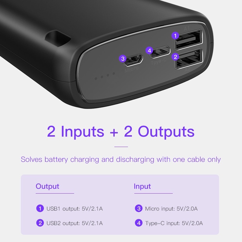 • Pin sạc dự phòng 2 cổng: 2 cổng đầu ra USB tiêu chuẩn hỗ trợ sạc bình thường cho tất cả thiết bị tương thích. Giúp tiết kiệm thời gian sạc, thiết kế 2 cổng hỗ trợ sạc 2 thiết bị cùng lúc, do đó cải thiện hiệu suất sạc cao hơn, bạn cũng có thể mang theo sản phẩm bên mình;
