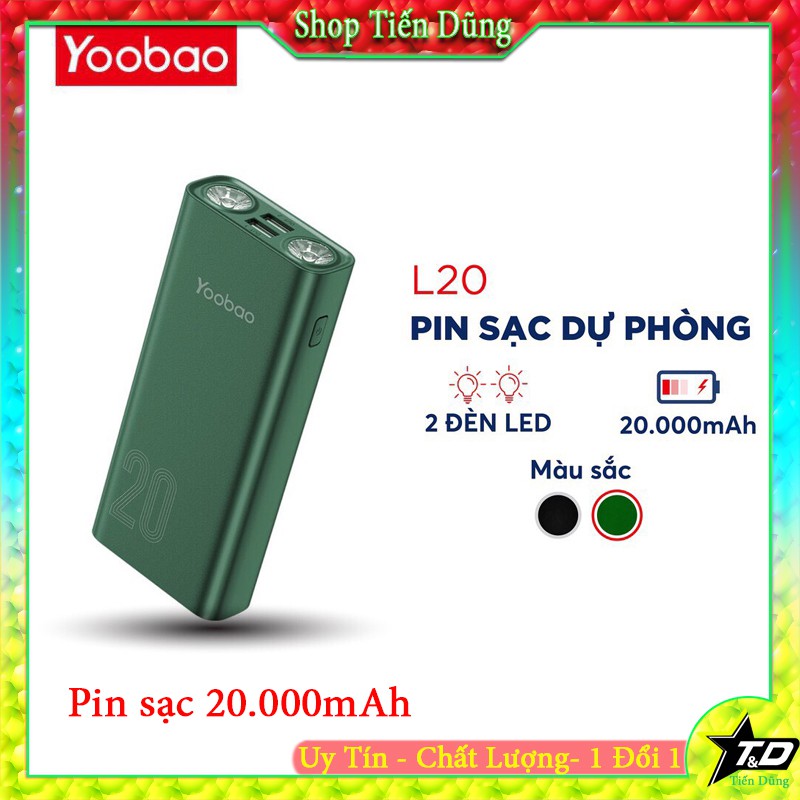 - Sạc dự phòng Yoobao L20 20000mAh thiết kế bắt mắt, độc đáo với 2 đèn Led siêu sáng, giống như một chiếc đèn Pin rất tiện lợi cho những chuyến đi xa.
