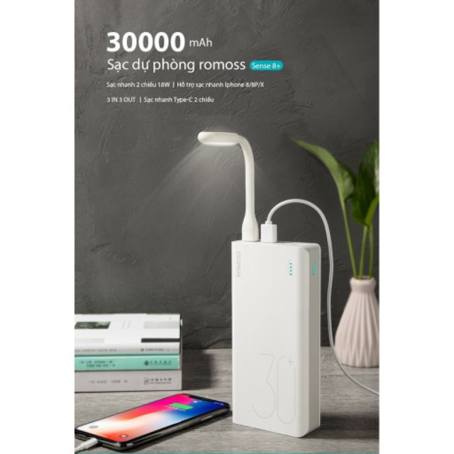 Điện Thoại & Phụ Kiện > Pin sạc dự phòng > >20000mAh || Pin sạc dự phòng lõi Polymer Romoss Sense 8+ 30000mAh hỗ trợ sạc nhanh QC3.0 (Trắng) - Hãng phân phối chính thứcCòn hàng