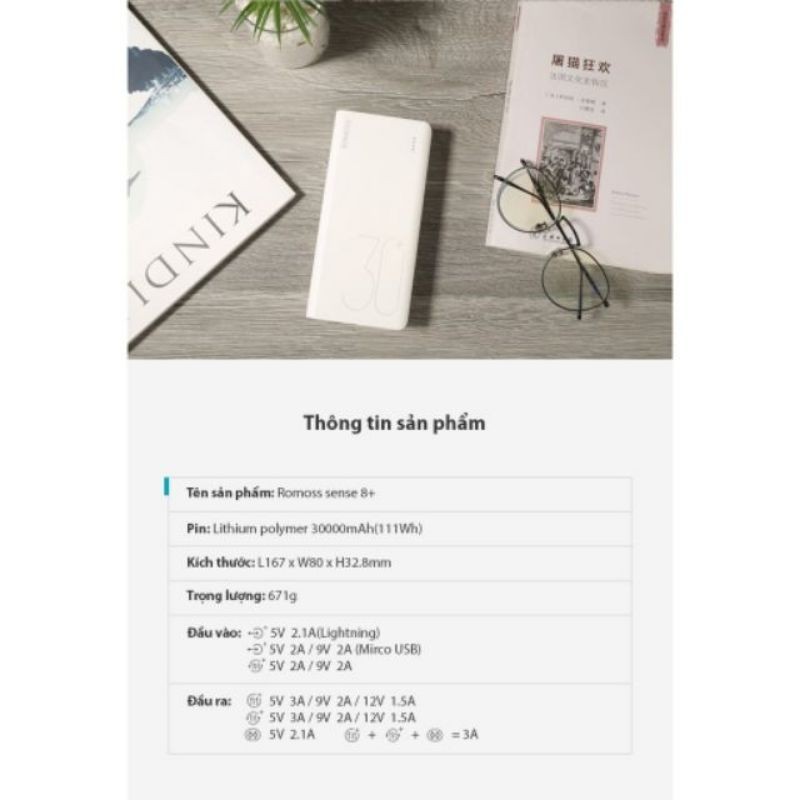 Giới thiệu Pin sạc dự phòng lõi Polymer Romoss Sense 8+ 30000mAh hỗ trợ sạc nhanh QC3.0 (Trắng) - Hãng phân phối chính thức