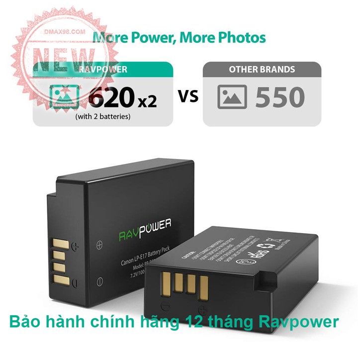 Pin sạc dự phòng LP-E17 cho máy ảnh canon chính hãng RavpowerBộ 2 pin sạc Canon LP-E17 dung lượng 1000mAh cung cấp 620 lần chụp.