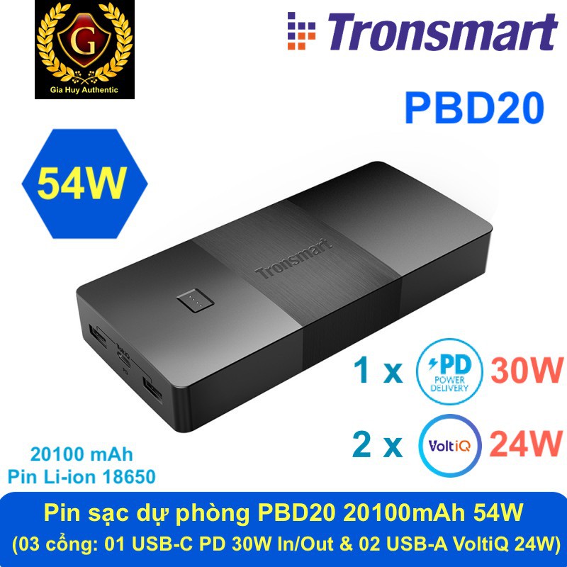 Điện Thoại & Phụ Kiện > Pin sạc dự phòng > >20000mAh || Pin sạc dự phòng Macbook Air TRONSMART PBD20 Brio 20100 mAh 54W (01 PD 30W & 02 VoltIQ 24W)Còn hàng