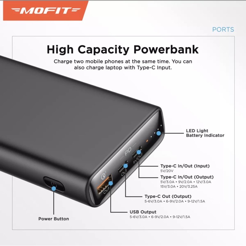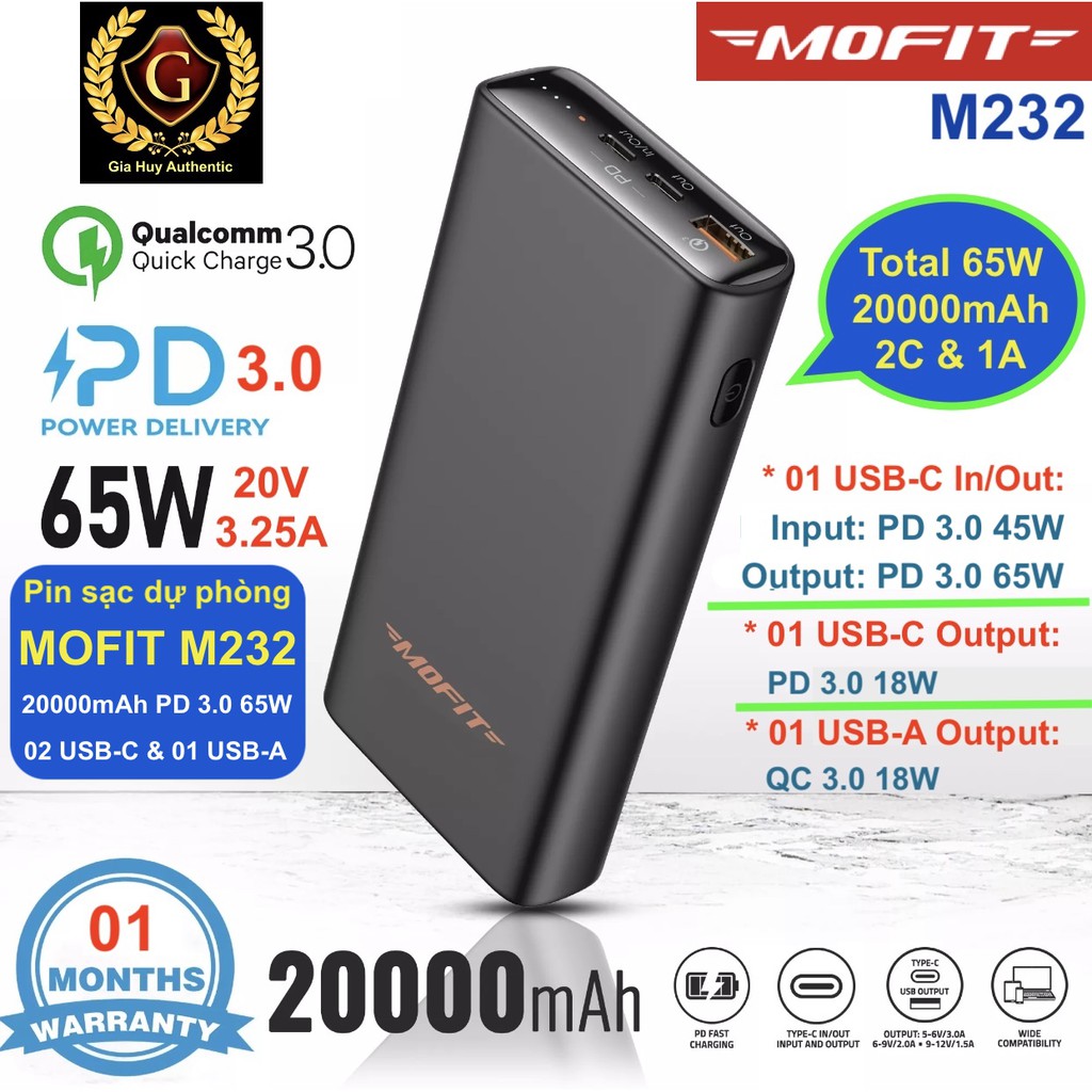 - Điểm đặc biệt ở MOFIT M232 là cổng USB-C In/Out chỉ cần đầu vào 45W (chỉ cần sạc lại cho MOFIT M232 bằng củ sạc PD 45W của bạn), nhưng công suất đầu ra lên đến 65W (20V/3.25A)
