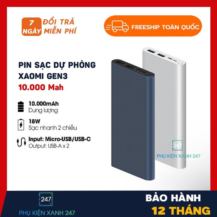 ✔️ Mi Gen 3 dung lượng 10000mah, sạc siêu nhanh, an toàn cho pin điện thoại✔️ Dung lượng PIN 10.000mAh Li-Polymer