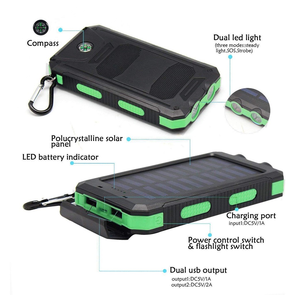 1. Công suất thiết kế 20000mAh, (chia 2 cổng), có thể nạp năng lượng dưới ánh sáng mặt trời.