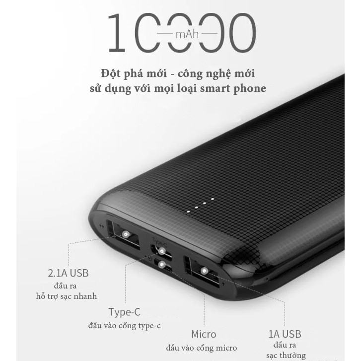 • Hỗ trợ 2 cổng sạc vào với đầu Micro USB & Type C