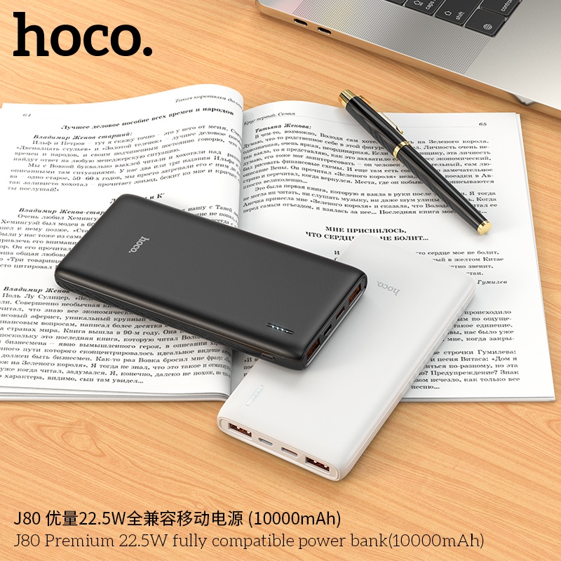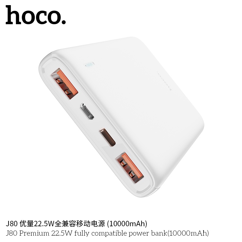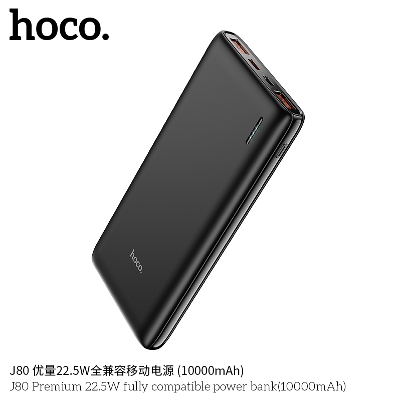 SẠC DỰ PHÒNG HOCO J80 SẠC NHANH SIÊU TỐC PD 20W / 10000MAH - CHÍNH HÃNGSạc dự phòng Hoco J80 hỗ trợ sạc nhanh công suất PD20W siêu tốc, dung lượng 10000mAh, công suất tiêu thụ khi sạc đạt 70%, có thể sạc đầy từ 2-2,5 lần cho điện thoại dung lượng pin 3000mAh (như iPhone XS Max hoặc Samsung S10 Plus) tích hợp 2 cổng ra USB, 2 cổng vào MicroUSB và Type C để cắm điện cho SDP này, trên J80 có đèn báo hiển thị vạch pin. J80 sạc cho tất cả các thiết bị điện thoại Smartphone và máy tính bảng