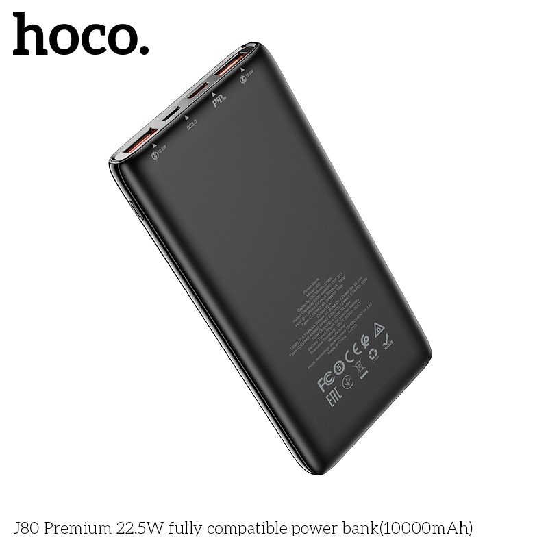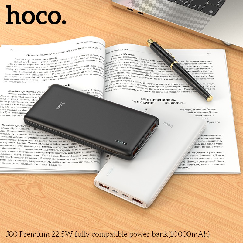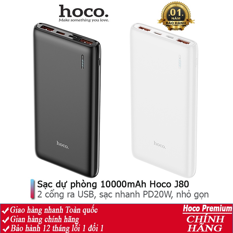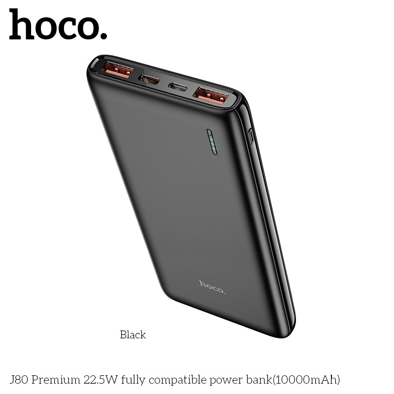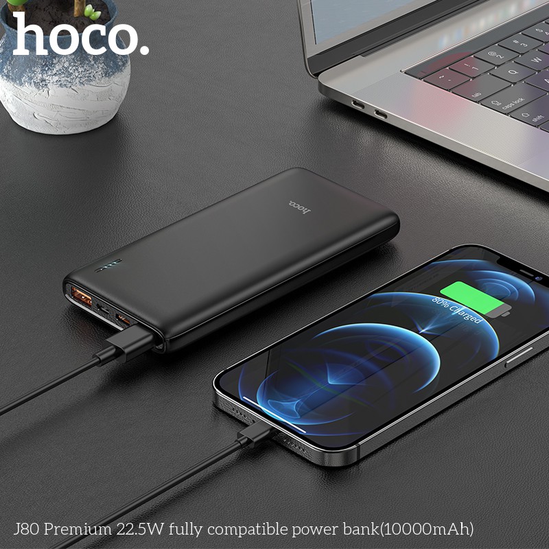SẠC DỰ PHÒNG HOCO J80 SẠC NHANH SIÊU TỐC PD 20W / 10000MAH - CHÍNH HÃNGSạc dự phòng Hoco J80 hỗ trợ sạc nhanh công suất PD20W siêu tốc, dung lượng 10000mAh, công suất tiêu thụ khi sạc đạt 70%, có thể sạc đầy từ 2-2,5 lần cho điện thoại dung lượng pin 3000mAh (như iPhone XS Max hoặc Samsung S10 Plus) tích hợp 2 cổng ra USB, 2 cổng vào MicroUSB và Type C để cắm điện cho SDP này, trên J80 có đèn báo hiển thị vạch pin. J80 sạc cho tất cả các thiết bị điện thoại Smartphone và máy tính bảng