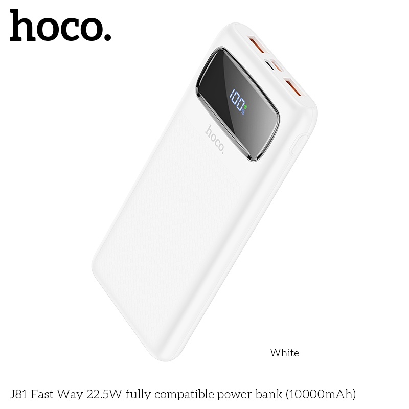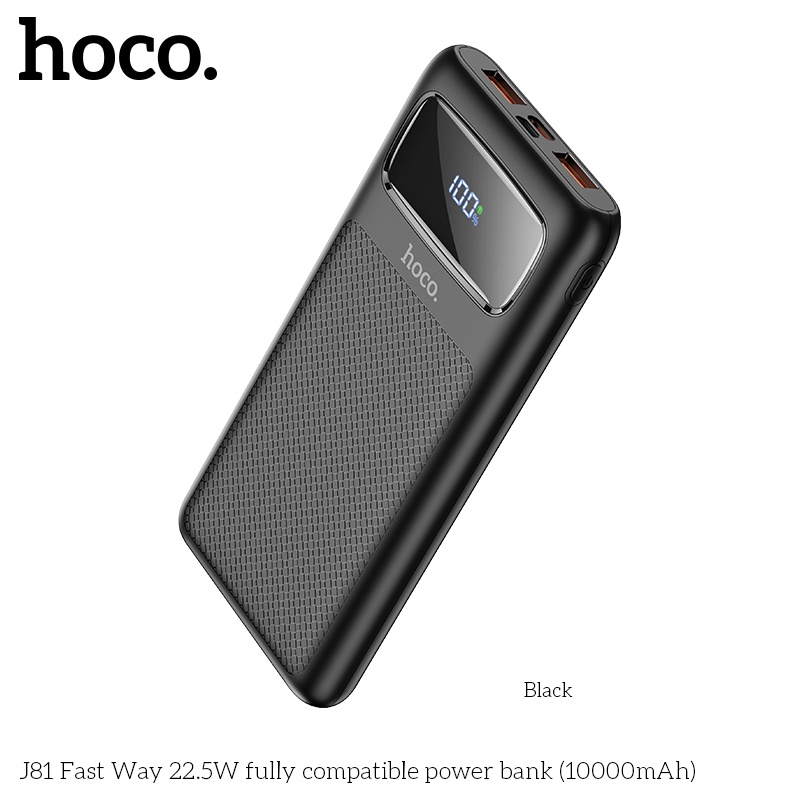 SẠC DỰ PHÒNG HOCO J81 SẠC NHANH SIÊU TỐC PD 22.5W / 10000MAH - CHÍNH HÃNGSạc dự phòng Hoco J81 hỗ trợ sạc nhanh công suất PD20W siêu tốc, dung lượng 10000mAh, công suất tiêu thụ khi sạc đạt 70%, có thể sạc đầy từ 2-2,5 lần cho điện thoại dung lượng pin 3000mAh (như iPhone XS Max hoặc Samsung S10 Plus) tích hợp 2 cổng ra USB, 2 cổng vào MicroUSB và Type C để cắm điện cho SDP này, trên J81 có đèn báo hiển thị vạch pin. J81 sạc cho tất cả các thiết bị điện thoại Smartphone và máy tính bảng
