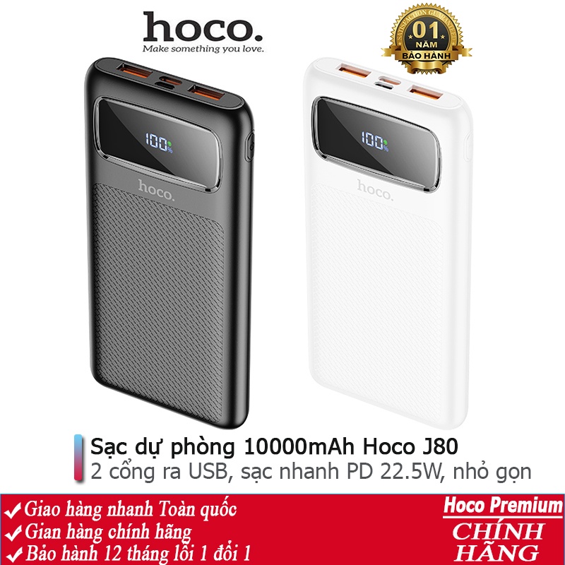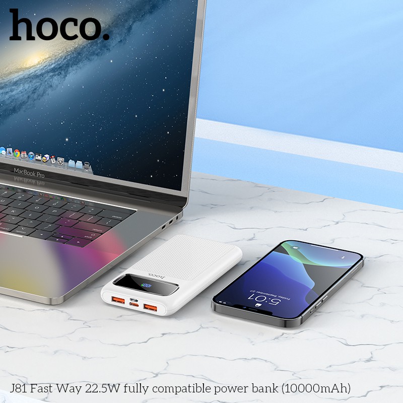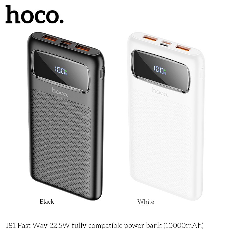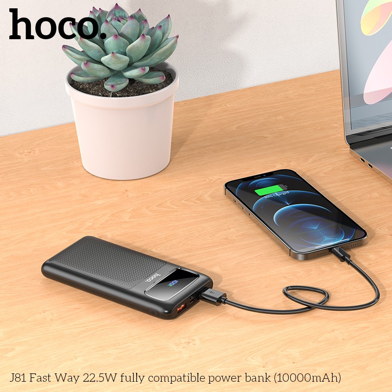 SẠC DỰ PHÒNG HOCO J81 SẠC NHANH SIÊU TỐC PD 22.5W / 10000MAH - CHÍNH HÃNGSạc dự phòng Hoco J81 hỗ trợ sạc nhanh công suất PD20W siêu tốc, dung lượng 10000mAh, công suất tiêu thụ khi sạc đạt 70%, có thể sạc đầy từ 2-2,5 lần cho điện thoại dung lượng pin 3000mAh (như iPhone XS Max hoặc Samsung S10 Plus) tích hợp 2 cổng ra USB, 2 cổng vào MicroUSB và Type C để cắm điện cho SDP này, trên J81 có đèn báo hiển thị vạch pin. J81 sạc cho tất cả các thiết bị điện thoại Smartphone và máy tính bảng