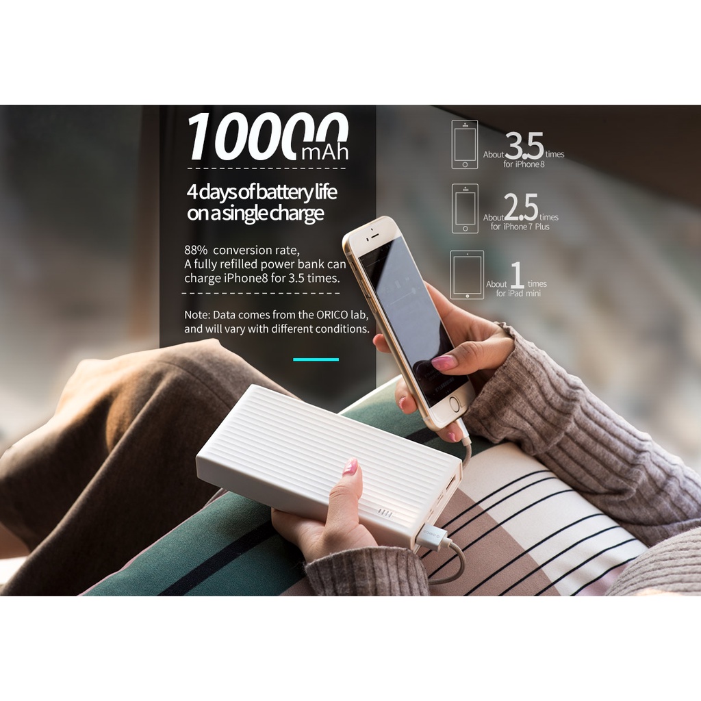 Orico K10000 10000mAh có thể được sử dụng để sạc đầy iPhoneX đến 3 lần, 1 lần iPadmini4,3 lần Samsung S9, . Giờ đây bạn không cần phải lo lắng về vấn đề điện thoại hoặc các thiết bị điện tử khác hết pin trong những chuyến đi dài ngày.
