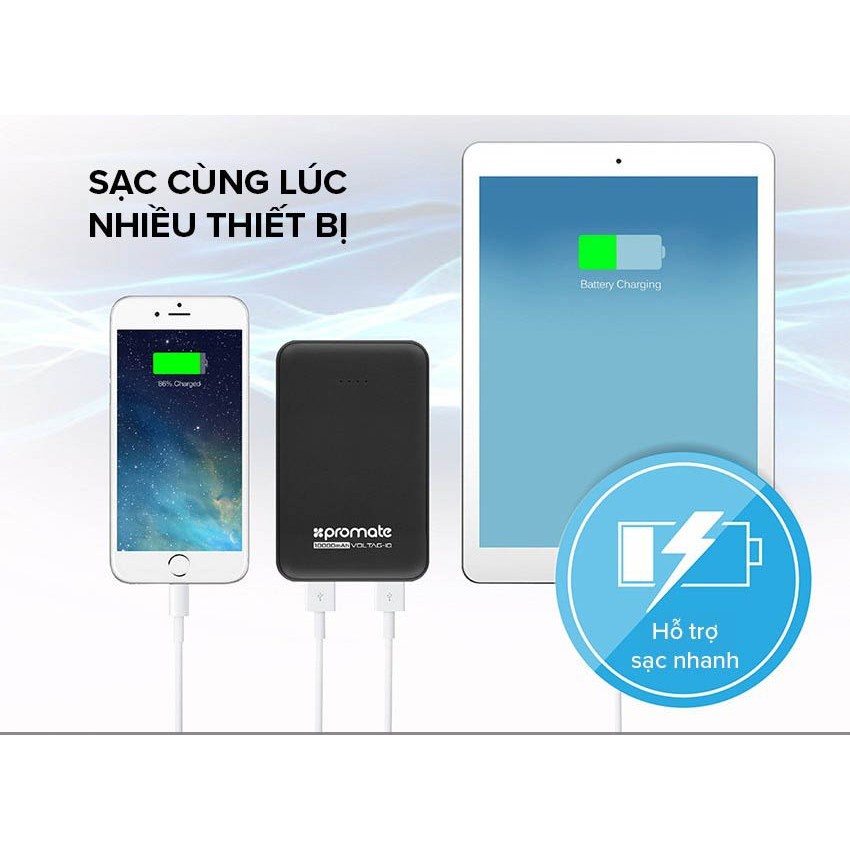 Pin sạc dự phòng Promate VOLTAG-10 với dung lượng pin lên đến 10000mAh giúp bạn hoàn toàn có thể sạc các dòng điện thoại iPhone 7, iPhone 8, từ 2 đến 3 lần trở lên hoặc sạc đầy hầu hết các dòng máy tính bảng tầm trung. Ngoài ra, VOLTAG-10 trang bị hai cổng USB output 5V/1A và 5V/2A để bạn thoải mái sạc cùng lúc 2 thiết bị. Đặc biệt, nếu bạn sạc thiết bị điện tử ở cổng 5V/2A thì thời gian sạc sẽ nhanh gấp đôi khi sạc ở cổng 5V/1A. Giờ đây, bạn không chỉ được sạc pin mọi lúc mọi nơi mà còn chia sẻ được với bạn bè.