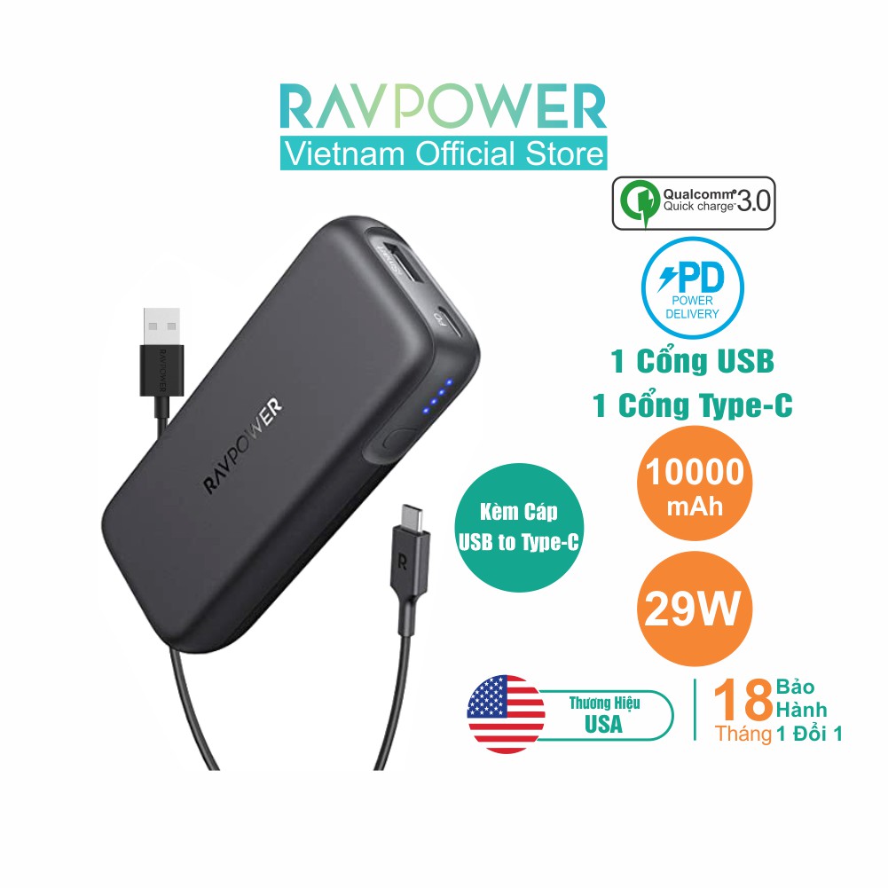 Điện Thoại & Phụ Kiện > Pin sạc dự phòng > 5000 - 10000mAh || Pin Sạc Dự Phòng RAVPower 10000mAh In/Out Type-C QC 3.0 + PD 29WCòn hàng