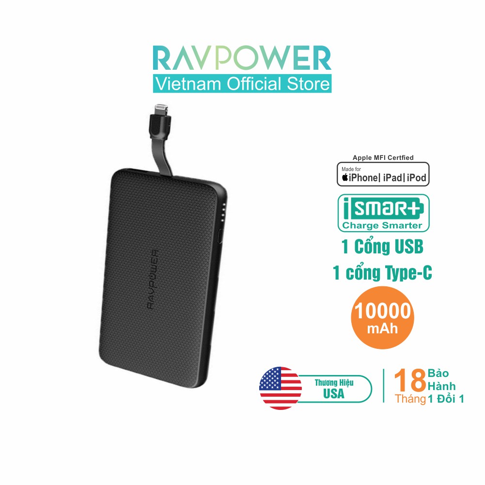 Pin Sạc Dự Phòng RAVPower 10000mAh 17, 5W Tích Hợp Cáp Lighning, MFI, RP- PB099