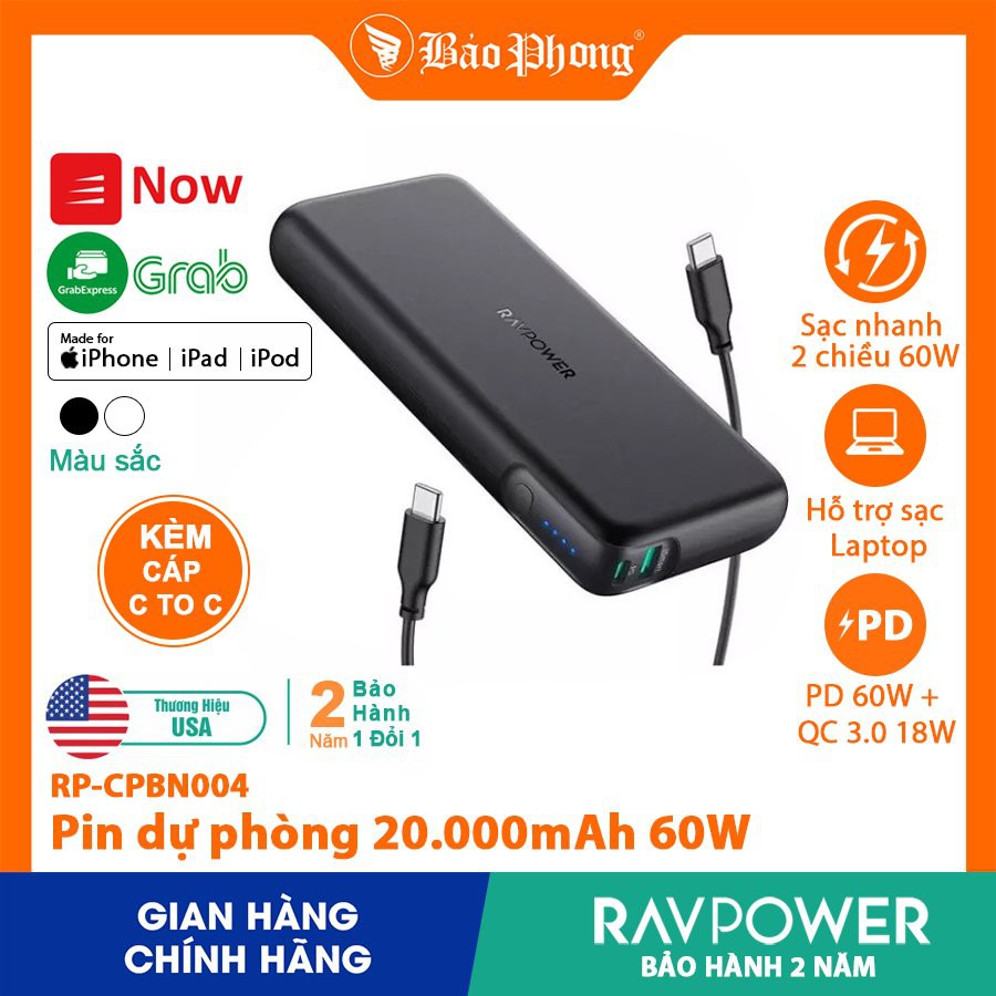Điện Thoại & Phụ Kiện > Pin sạc dự phòng > 10000 - 20000mAh || Pin Sạc dự phòng RAVPower 20000mAh 60w PD3.0 RP-CPBN004 cho iPhone iPad IP 6 7 8 Plus 10 11 12 Pro max x xs giá rẻCòn hàng