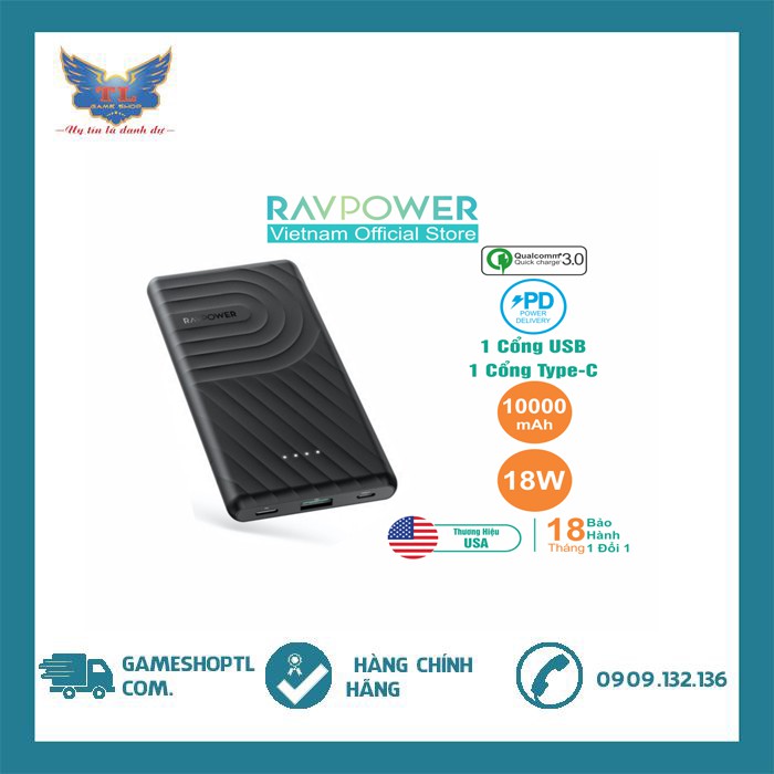 Điện Thoại & Phụ Kiện > Phụ kiện > Sạc dự phòng & Pin > Sạc dự phòng || Pin Sạc Dự Phòng RAVPower 10000mAh In/Out Type-C PD 18W, Quick Charge 3.0 - RP-PB195 -Còn hàng