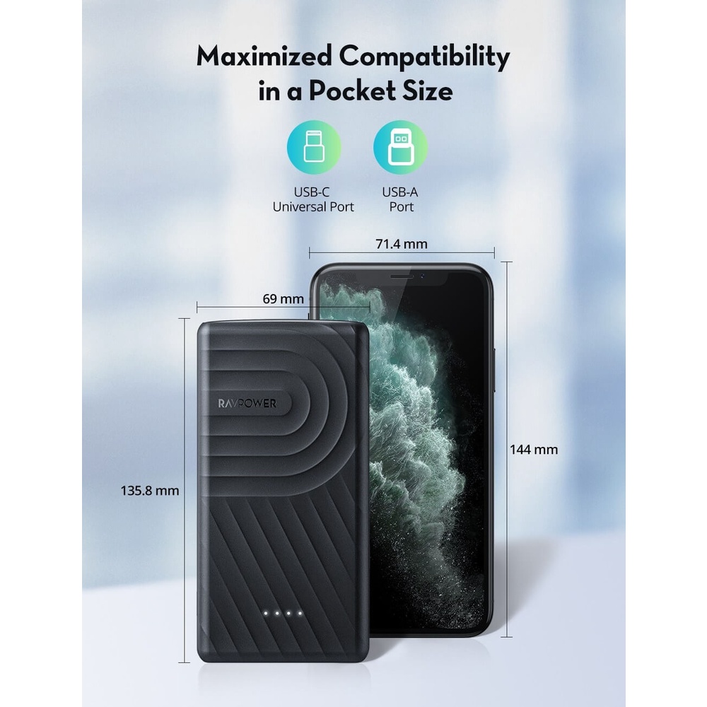 RAVPower RP-PB195 là dòng pin thông dụng nhưng được tích hợp 2 cổng sạc thiết bị Type-C PD 18W và USB-A Quick Charge 3.0 18W sẽ giúp quý khách sạc nhanh thiết bị và linh động hơn với loại cáp khác nhau.