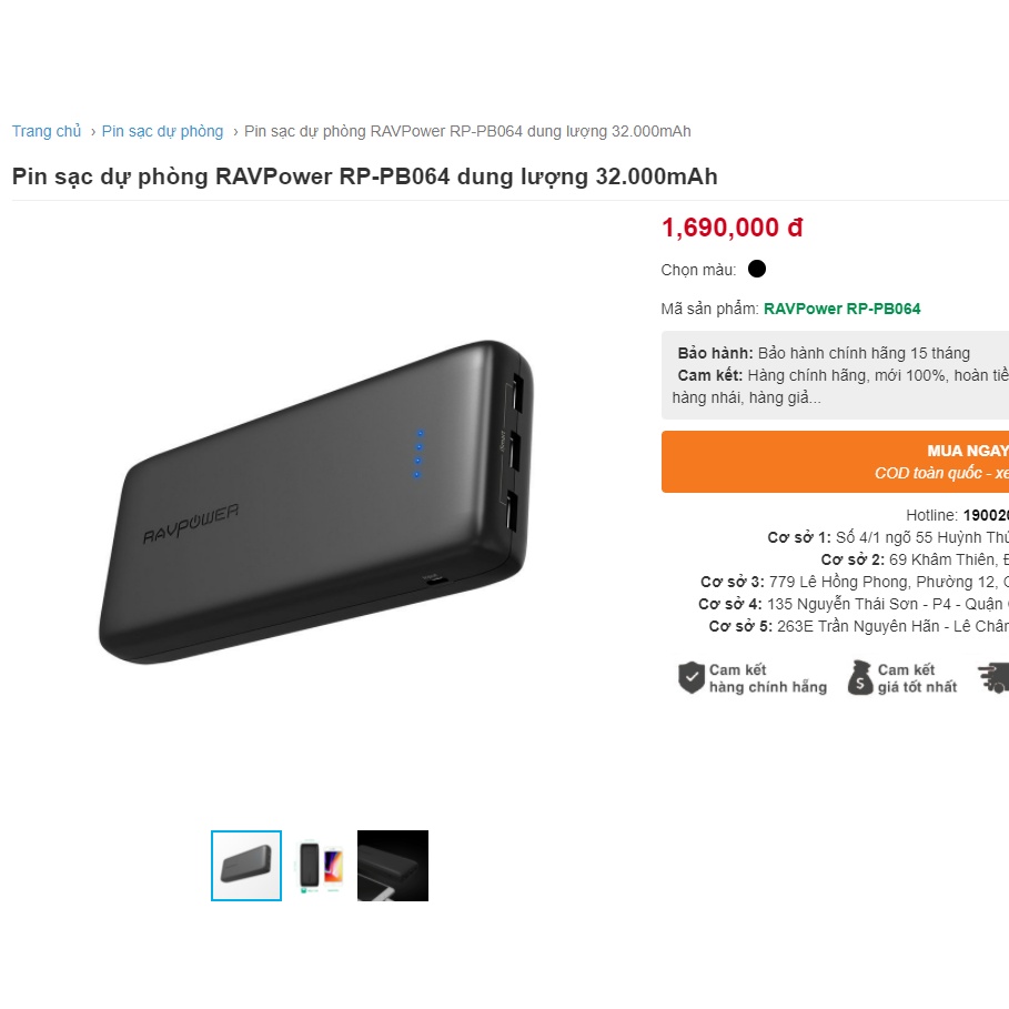 Điện Thoại & Phụ Kiện > Phụ kiện > Sạc dự phòng & Pin > Sạc dự phòng || Pin Sạc Dự Phòng RAVPower RP-PB064 Dung Lượng 32.000mAh - 3 Cổng Sạc Nhanh ismart+ - Hàng Chính Hãng VN - Bảo Hành 1 NămCòn hàng