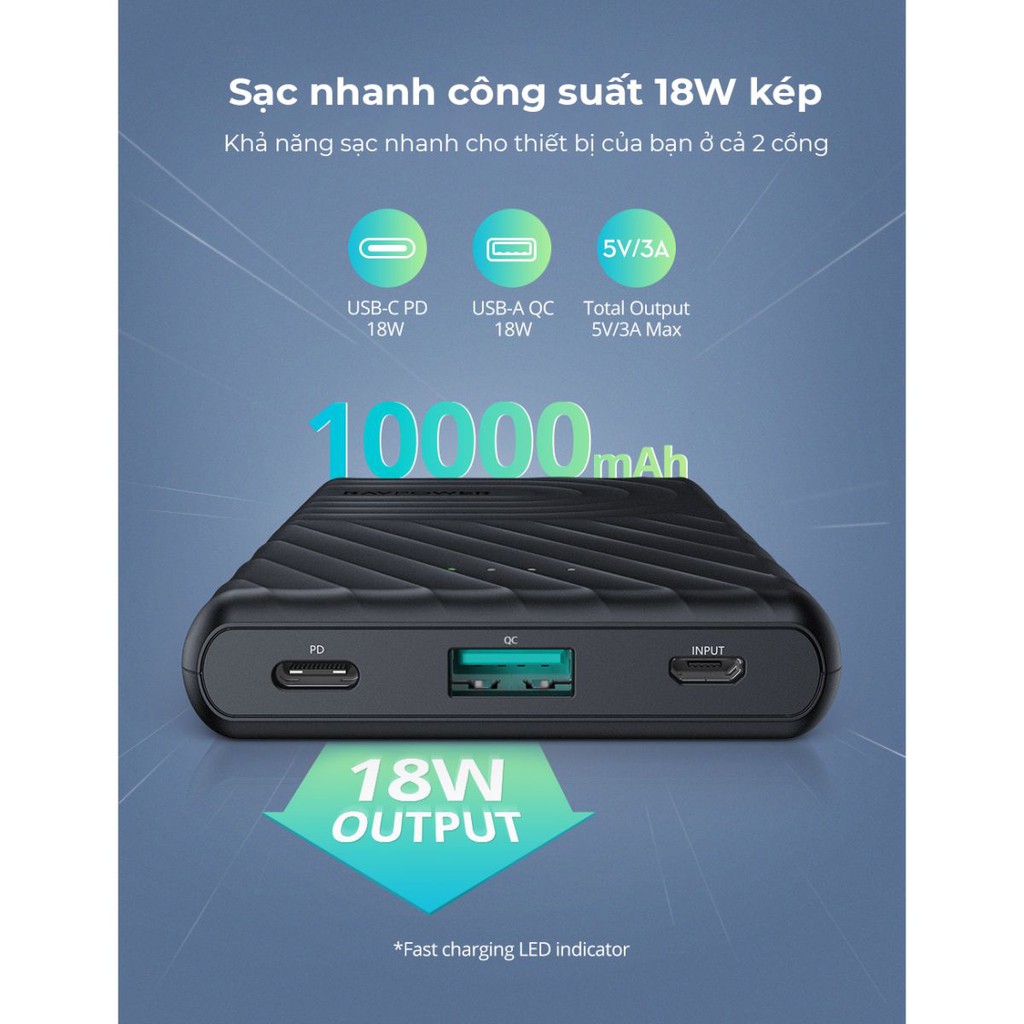 Giới thiệu Pin sạc dự phòng RAVPower RP-PB195 10000mAh Type-C PD 18W