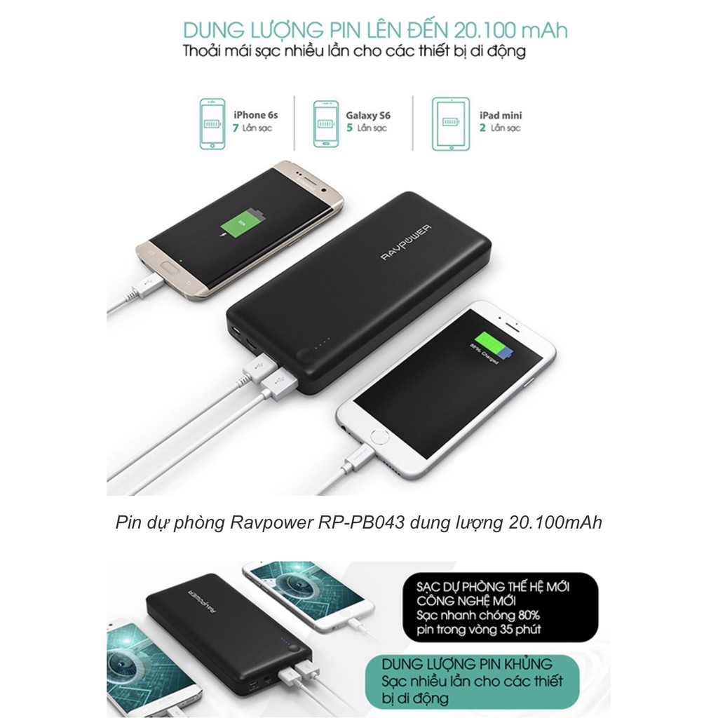 Điện Thoại & Phụ Kiện > Pin sạc dự phòng > 10000 - 20000mAh || Pin sạc dự phòng RAVPower RP-PB043 20100mAh QC 3.0 18W & USB-C 5V/3A (In/Out)Còn hàng