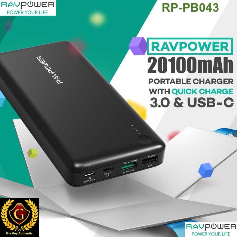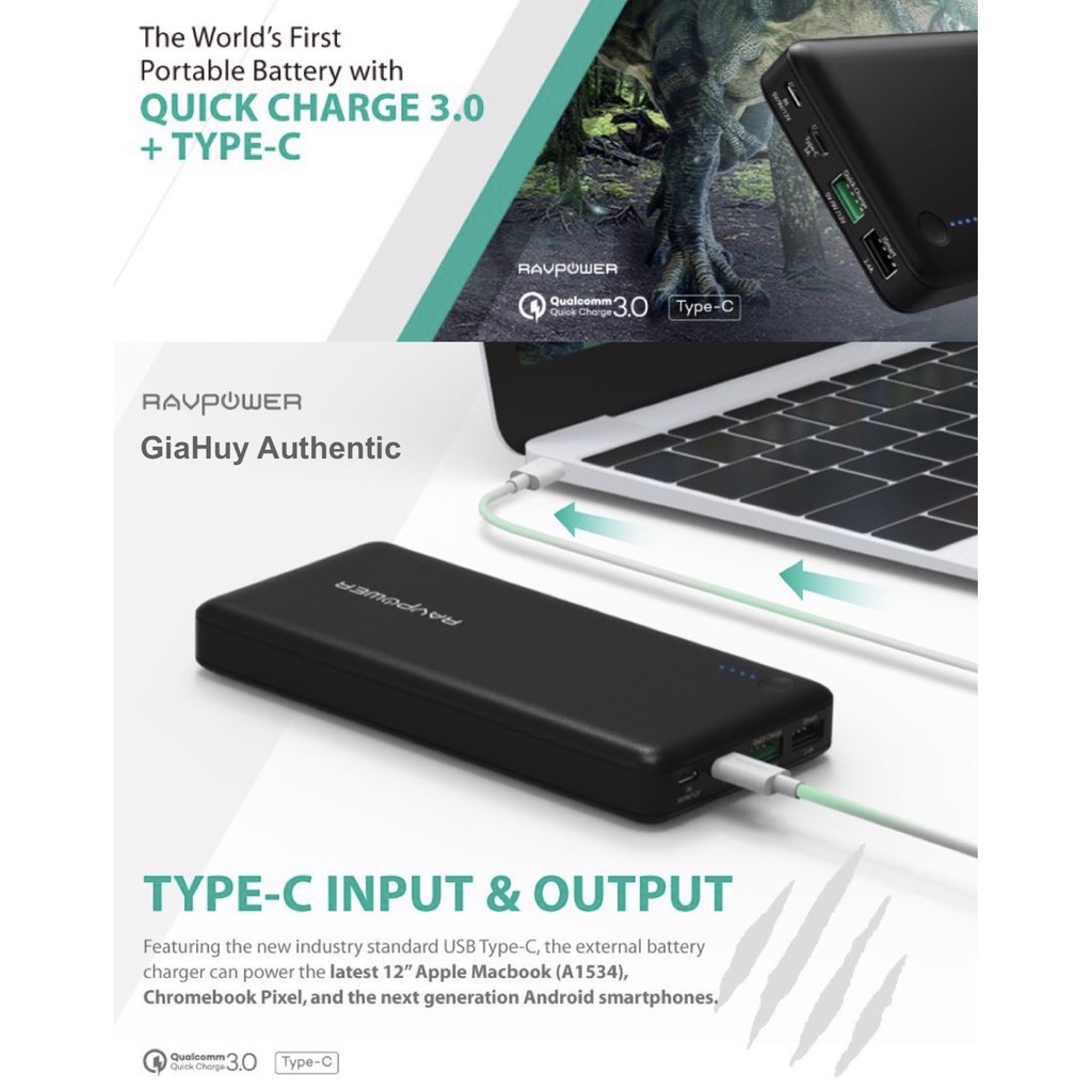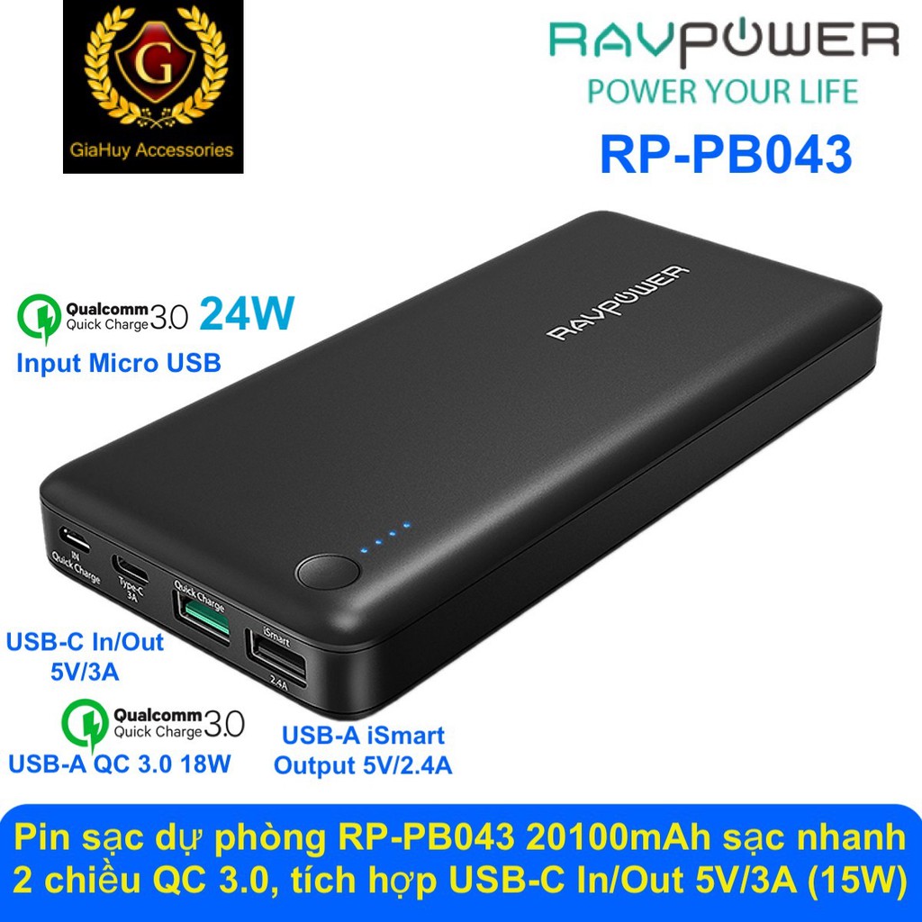 Pin sạc dự phòng RAVPower RPPB043 20100mAh QC 3.0 18W & USBC 5V/3A (In/Out)