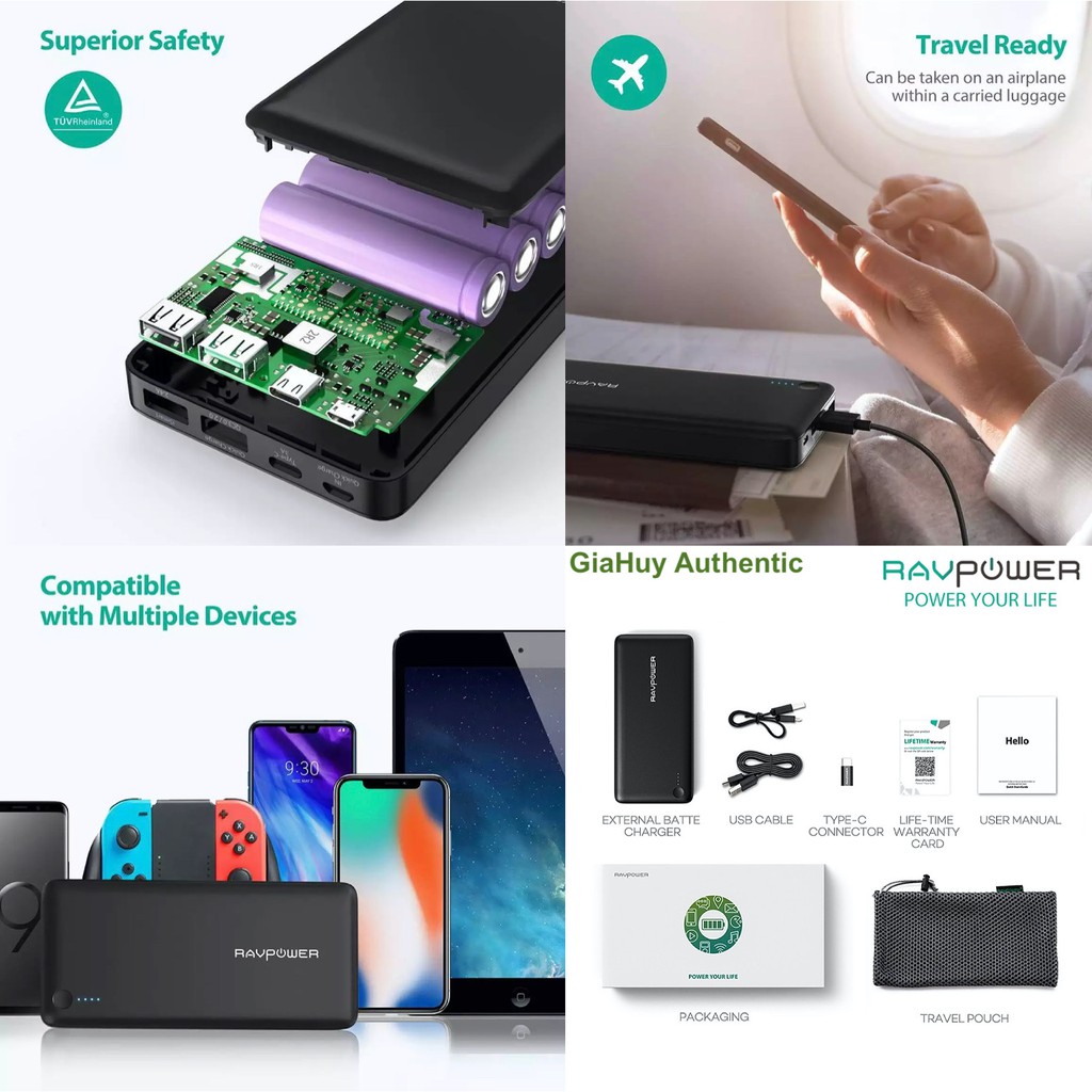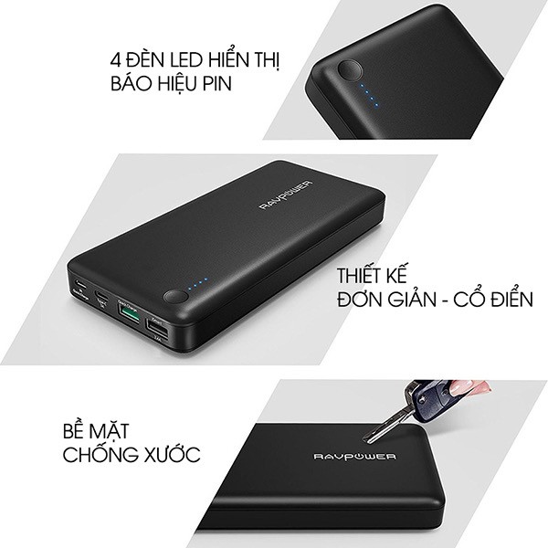 - Bạn luôn lo lắng rằng điện thoại và tablet hoặc các thiết bị khác cùng hết pin và gây ra bất tiện cho công việc của bạn. Đừng lo vì với pin dự phòng này bạn có thể bỏ qua sự lo lắng đó vì RAVPower hỗ trợ ba cổng USB đầu ra để bạn có thể sạc 03 thiết bị cùng lúc vô cùng tiện lợi.