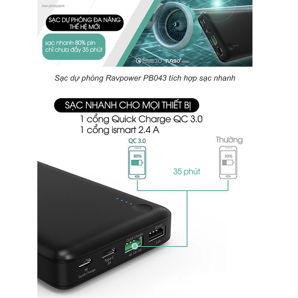 Giới thiệu Pin sạc dự phòng RAVPower RPPB043 20100mAh QC 3.0 18W & USBC 5V/3A (In/Out)