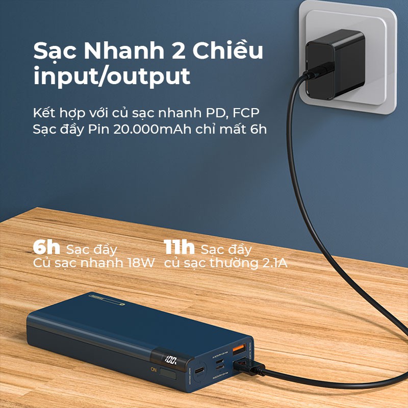 ⚡️ Kết với với bộ sạc nhanh 18W có thể sạc đầy pin dự phòng 20000mAh chỉ mất 6h.