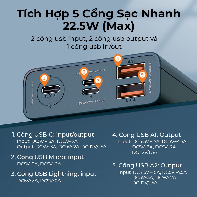 --> 2 cổng USB có công suất tối đa lên đến 22.5W