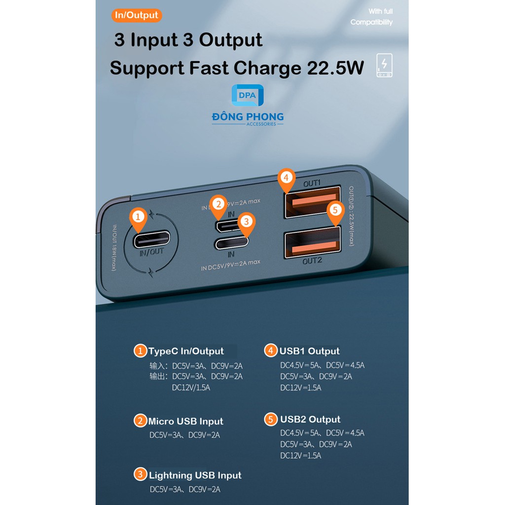 - Đầu vào của pin được trang bị cùng lúc 3 giao tiếp là 1 cổng Micro USB và 2 cổng Type C. Nó cũng đi kèm công nghệ sạc nhanh với điện áp tối đa là DC 5V/2A giúp tiết kiệm thời gian nạp đầy pin sau mỗi lần sử dụng.