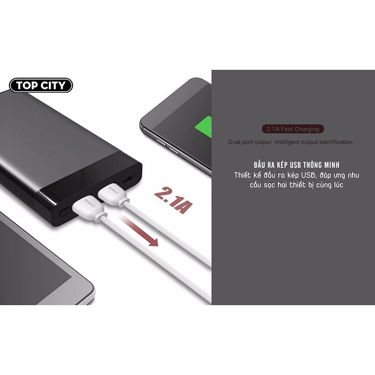 Remax RPP-120 được trang bị 2 cổng USB hỗ trợ sạc cùng lúc 2 thiết bị di động với nguồn ra DC5V/2.1A hunglongpc. Với 2 cổng USB, bạn dễ dàng nạp năng lượng tức thời cho điện thoại, máy tính bảng hoặc có thể chia sẻ 1 cổng sạc cho người xung quanh.