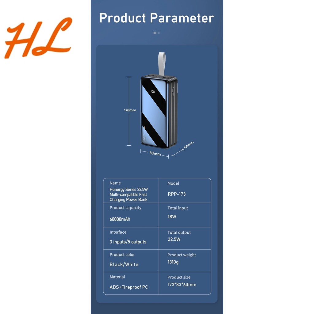 Điện Thoại & Phụ Kiện > Phụ kiện > Sạc dự phòng & Pin > Sạc dự phòng || Pin Sạc Dự Phòng Remax RPP-173 60000Mah 22.5W, Lõi Li-Polymer 3 CổNg Input / 5 CổNg Output, Đèn Led Siêu SángCòn hàng