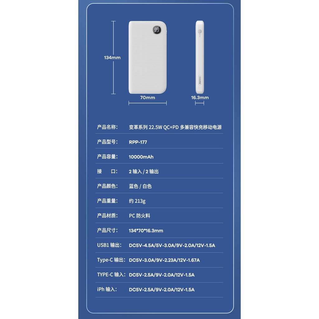 Pin Sạc Dự Phòng Remax RPP-177 10000mAh (Sạc Nhanh QC3.0, VOOC 22.5W, Type-C PD 20W)ĐẶC ĐIỂM NỔI BẬT: