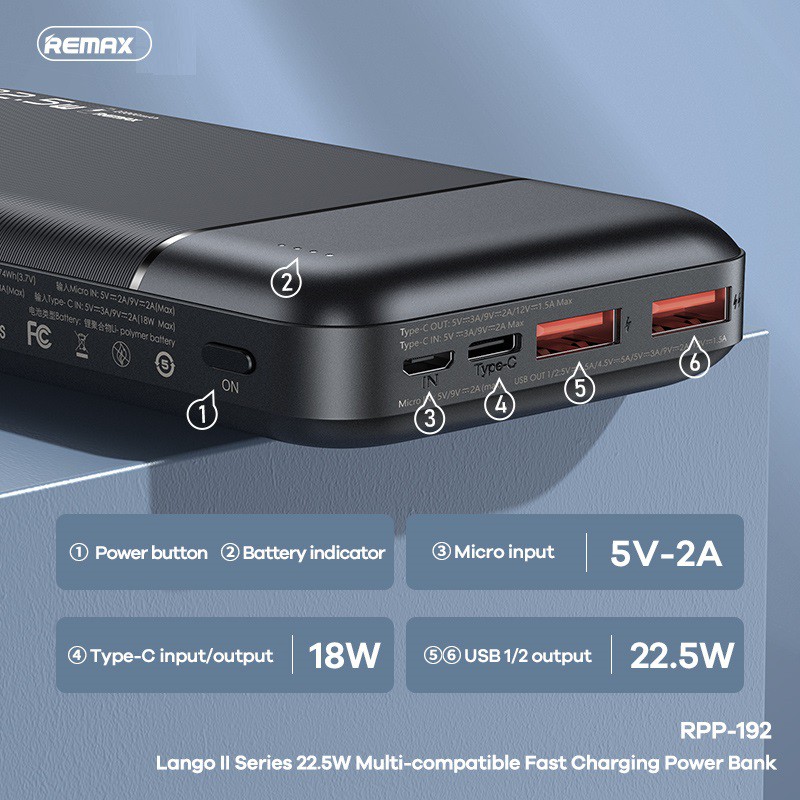 - Model: RPP-192 Tên: REMAX Ruiliang Lange 2 22.5W PD + QC dự phòng sạc nhanh đa năng tương thích